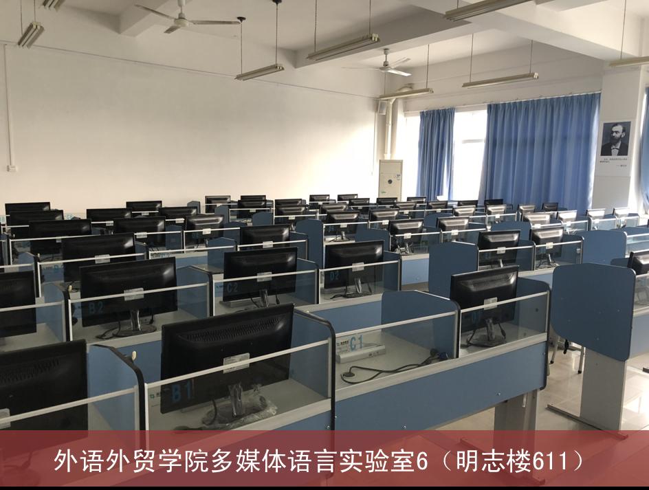 位于桂林航天工业学院北校区明志楼611教室,设备总值约29万元,占地面积90m2,建于2013年8月,实验室采用构架是蓝鸽LBD2000+型语言实验系统,此实验室适合商务英语的专业语音训练和教学,满足对自主口语训练和口语考试的专业要求。该实验室可同时容纳58人进行学习及相关口语听力考试。