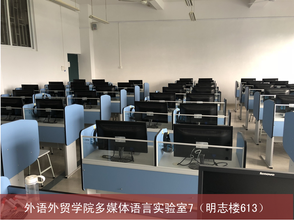 位于桂林航天工业学院北校区明志楼613教室,设备总值约29万元,占地面积90m2,建于2013年8月,实验室采用构架是蓝鸽LBD2000+型语言实验系统,此实验室适合商务英语的专业语音训练和教学,满足对自主口语训练和口语考试的专业要求。该实验室可同时容纳58人进行学习及相关口语听力考试。